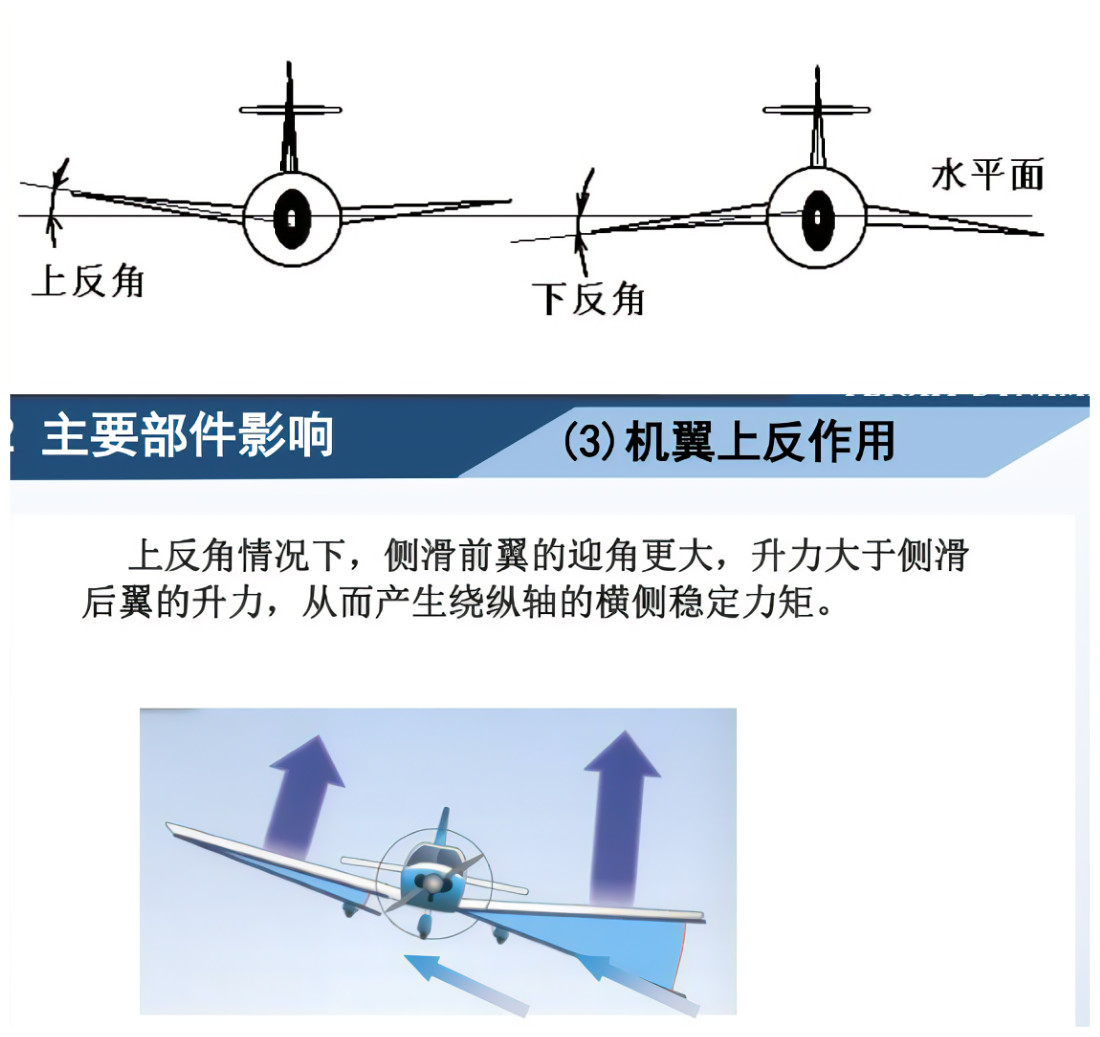 如图所示: 具有上反角的飞机有侧滑角时,侧滑前翼迎角增大,升力大于侧滑后翼的升力,从而产生偏航力矩、滚转力矩。