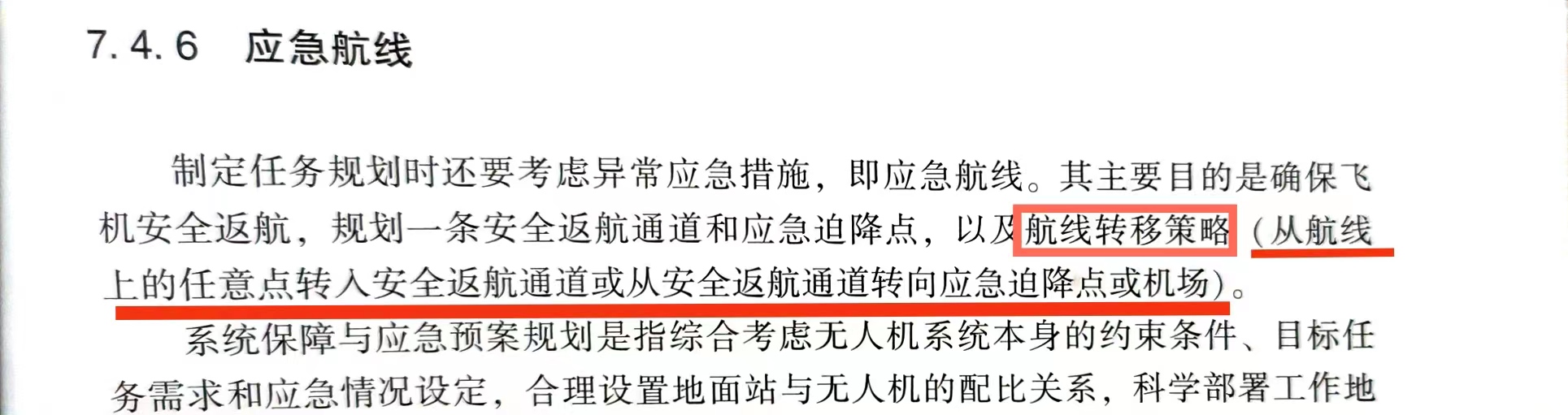 (参见《无人机驾驶员-航空知识手册》[2014年10月第1版].P181) 制定任务规划时还要考虑异常应急措施,即应急航线。其主要目的是确保飞机安全返航,规划一条安全返航通道和应急迫降点,以及航线转移策略。 航线转移策略:是指从航线上的任意点转入安全返航通道或从安全返航道转向应急迫降点或机场。