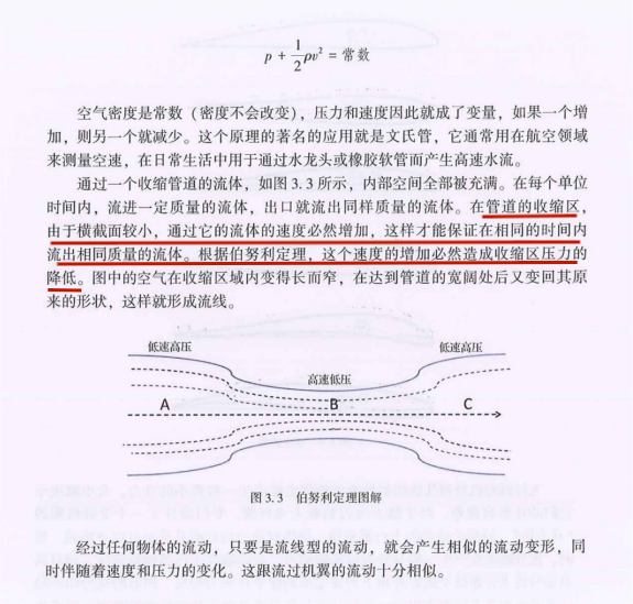 由于能量守恒定律,同一流管内横截面积大的地方静压更小;