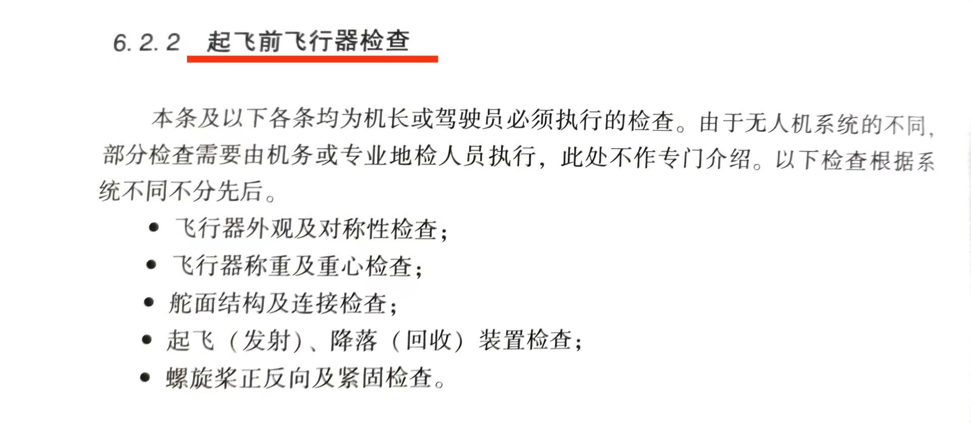 飞行器涂装指飞机外部绘制的图案。 根据题干可知,飞行器涂装与本题题干无关。 起飞前飞行器检查: (1)飞行器外观及对称性检查; (2)飞行器称重及重心检查; (3)舵面结构及连接检查; (4)起飞(发射)、降落(回收)装置检查; (5)螺旋桨正反向及紧固检查。 (参见《无人机驾驶员-航空知识手册》[2014年10月第1版].P148)