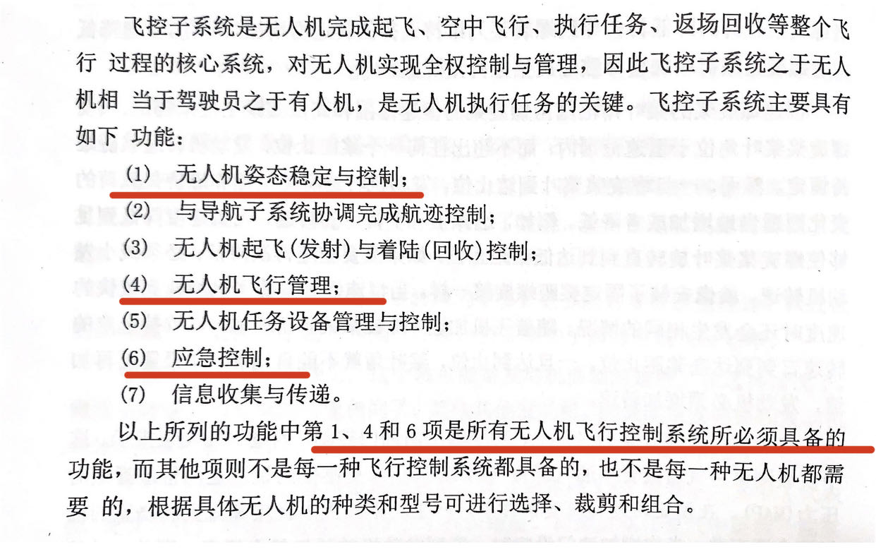 此题考点是飞控子系统的概念性知识,(参见《无人机驾驶员-航空知识手册》[2014年10月第1版].第27页)。 如图,1、4、7是所有无人机飞行控制系统所必须具备的功能。