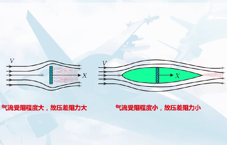 如图所示,两处X点,图1迎风面是个小矩形,图2迎风面积是个椭圆尖部,所以图1的迎风面积比图2迎风面积。所以,迎风面积越大,压差阻力越大