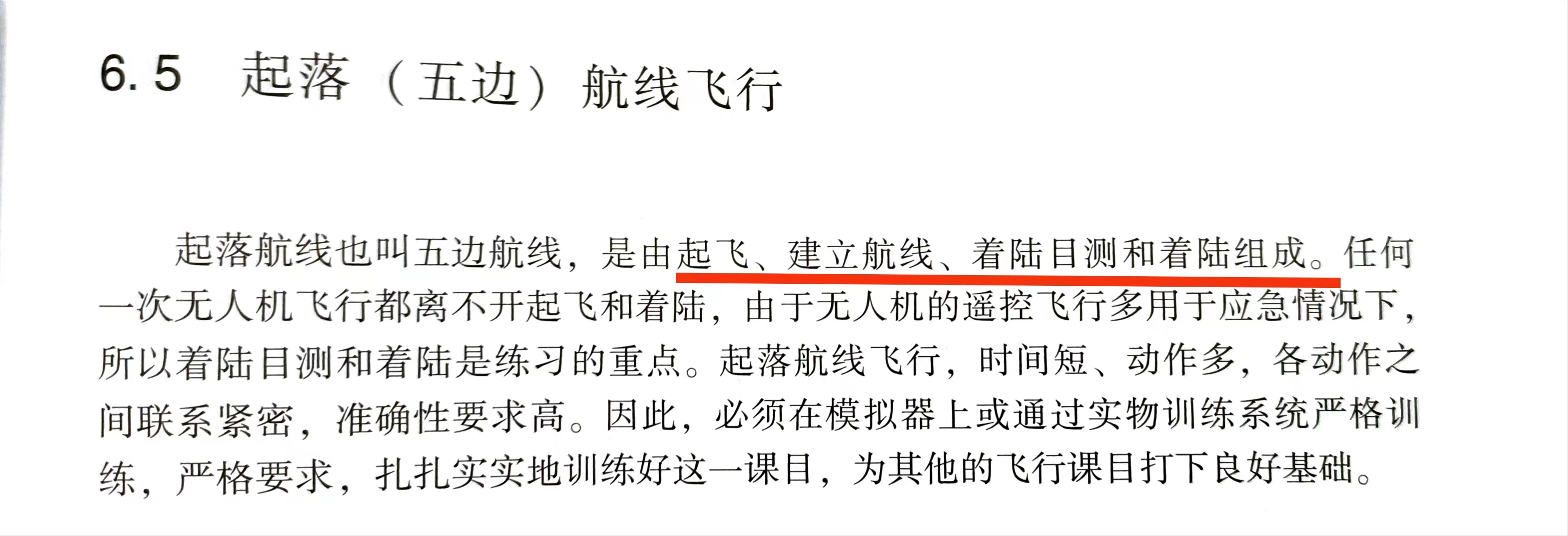 起落航线:也叫五边航线,是由起飞、建立航线、着陆目测和着陆组成。(其中,着陆目测和着陆是练习的重点) 起落航线(五边航线):是为在机场进行起飞着陆的航空器所规定的交通流程。 (参见《无人机驾驶员-航空知识手册》[2014年10月第1版].P153)