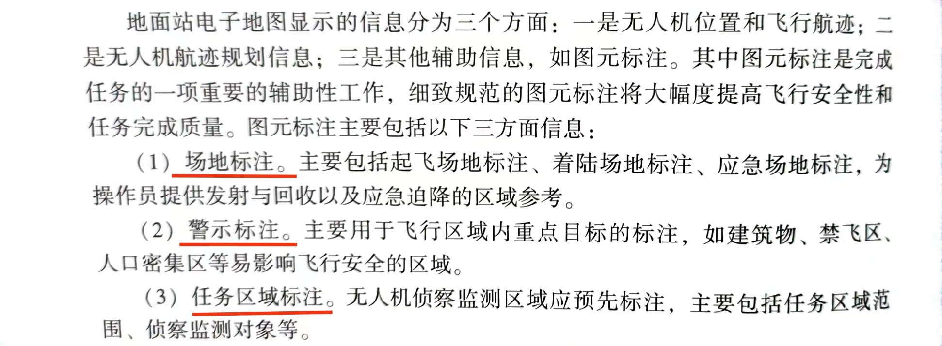 (参见《无人机驾驶员-航空知识手册》[2014年10月第1版].P178) 电子地图在无人机任务规划中的作用是显示无人机的飞行位置、画出飞行航迹、标注规划点以及显示规划航迹等。 电子地图图元标注主要包括:①场地标注;②警示标注;③任务区域标注。